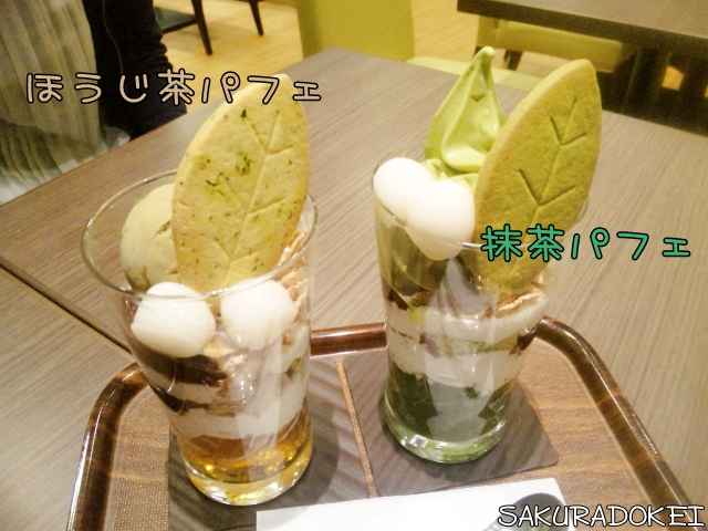 咲はほうじちゃパフェ、友達は抹茶パフェ。
